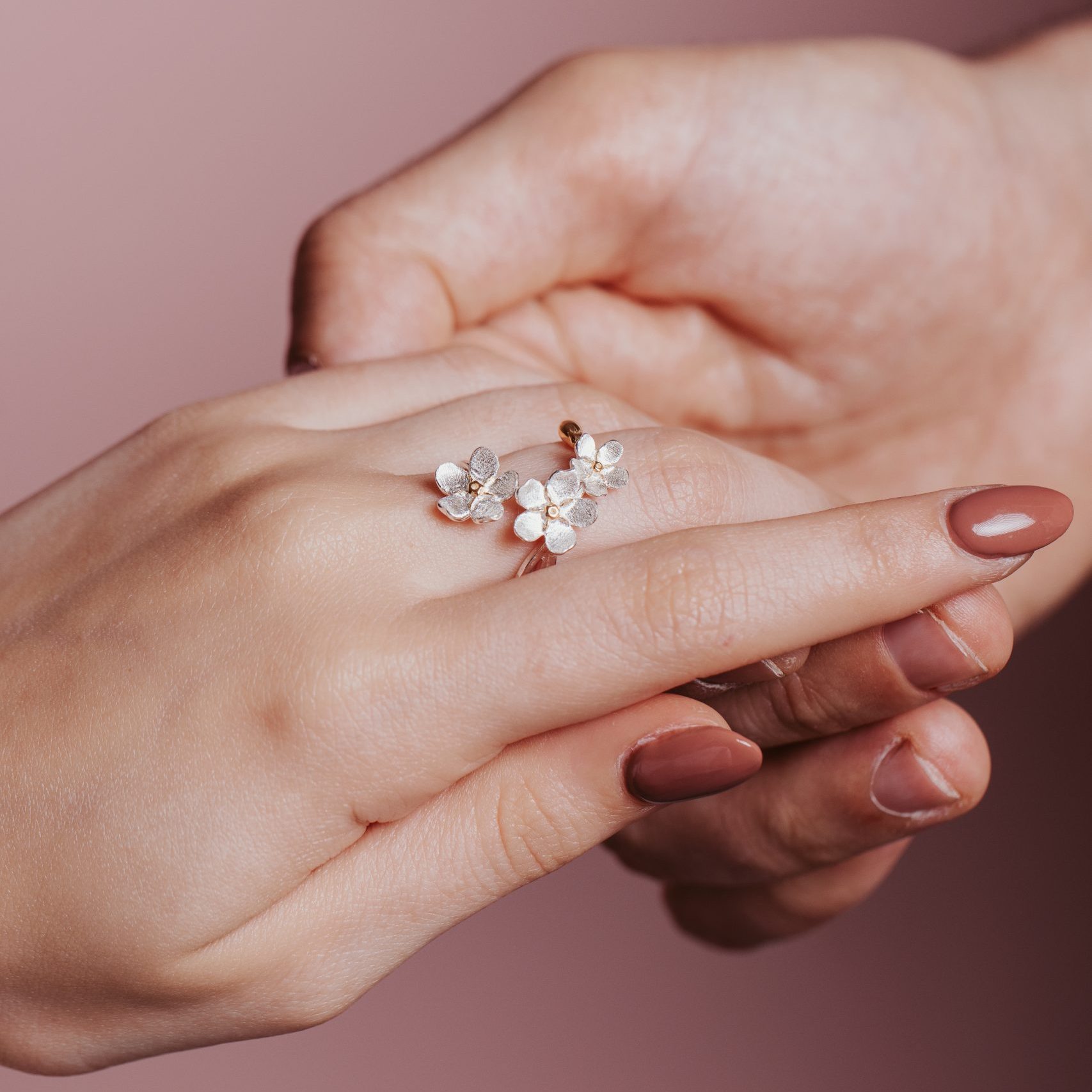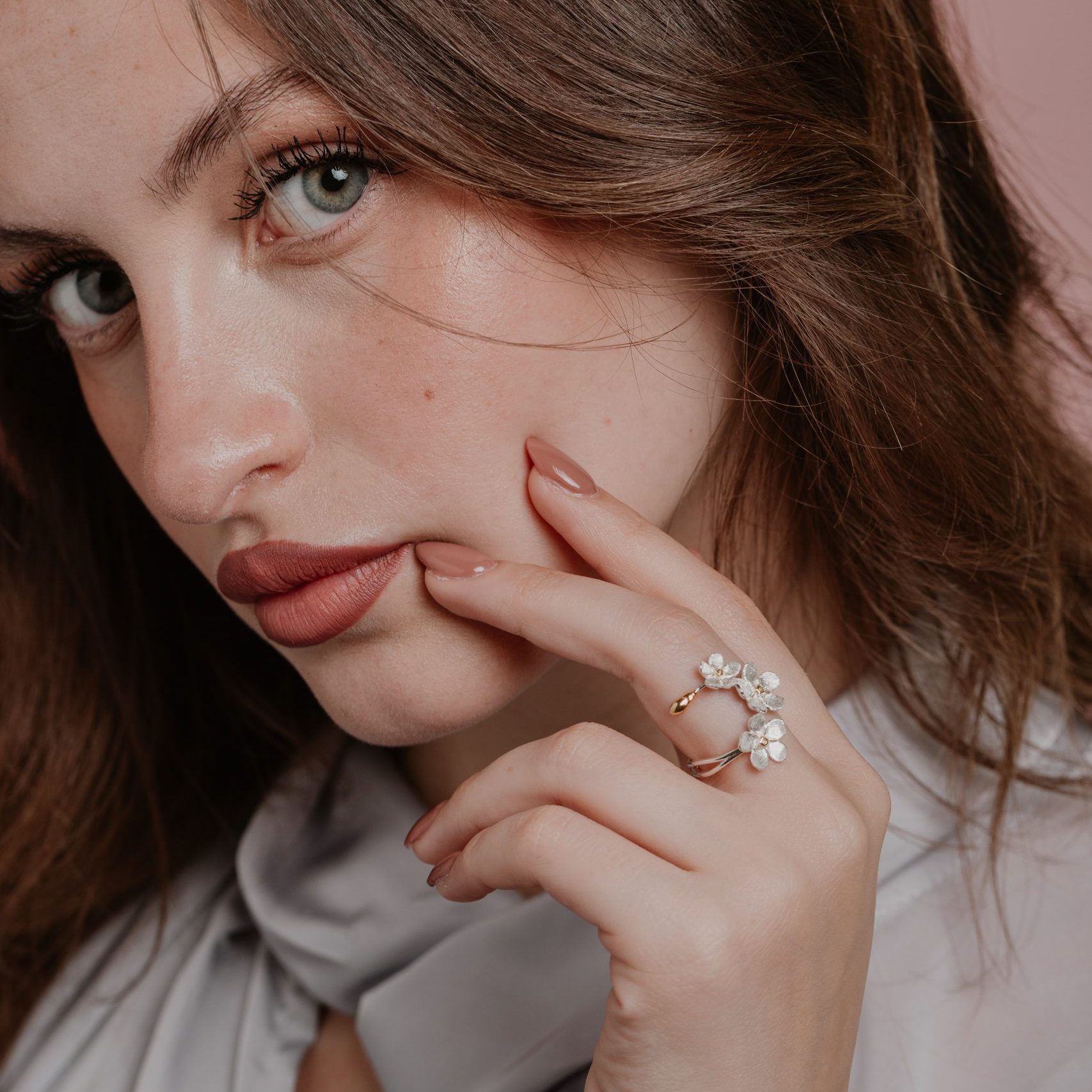 Un anello essenziale e raffinato: questo gioiello celebra la delicatezza della natura con tre elegantissime primule in fiore.